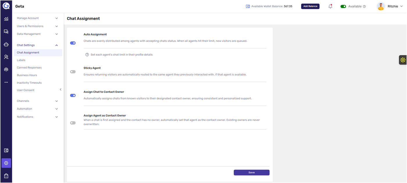 The Chat Assignment section allows you to control how incoming chats are routed to your agents. These settings help distribute workload efficiently, maintain consistency for returning users, and ensure each chat is handled by the right person.