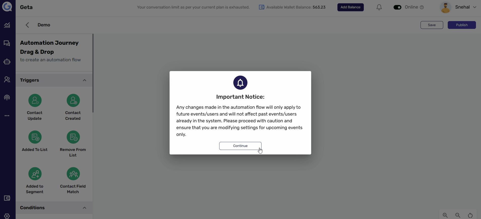 Configuring actions in an existing automation journey helps you fine-tune the workflow and adapt to changing needs. Here's how you can do it: