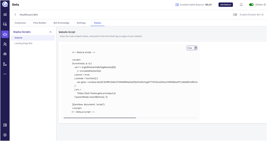 By deploying your bot, you make it live and ready to assist visitors on your website using Geta.ai.