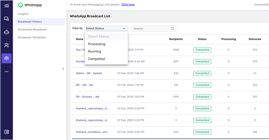 You can filter the broadcast list based on the Status of the campaigns. The available filter options include: