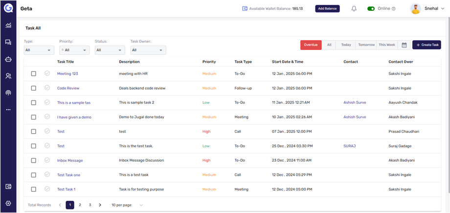 - Task Type – Filter by To-Do, Follow-Up, Call, or Meeting.