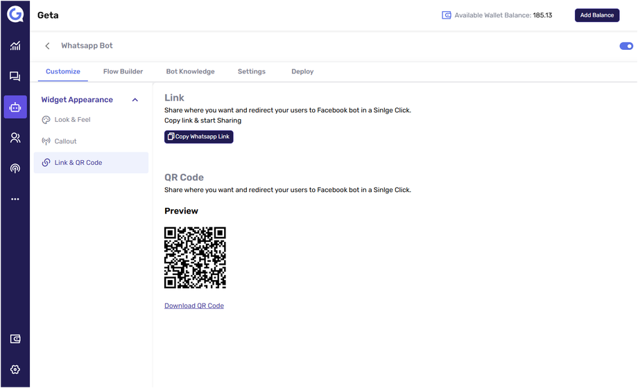 ✅ QR Code – Download and share the QR code. When users scan it, they will be redirected to your WhatsApp bot instantly.
