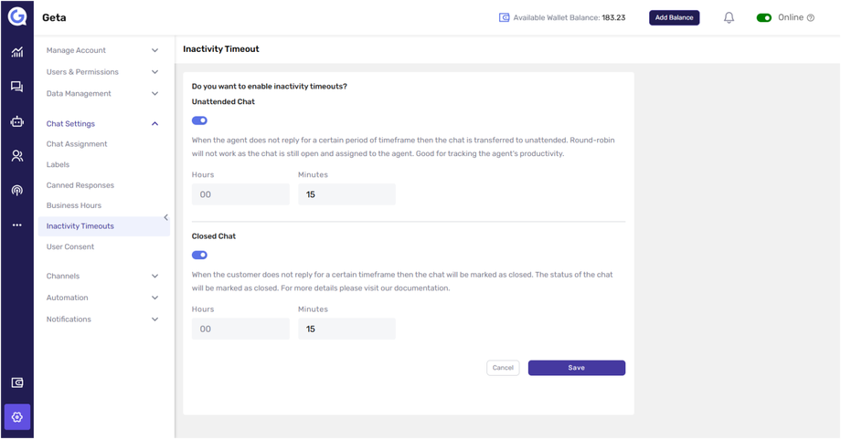 Setting inactivity timeouts helps ensure that no conversation is left unmonitored, and chats are closed efficiently when they become inactive. For more detailed information, you can refer to Geta.ai’s documentation.