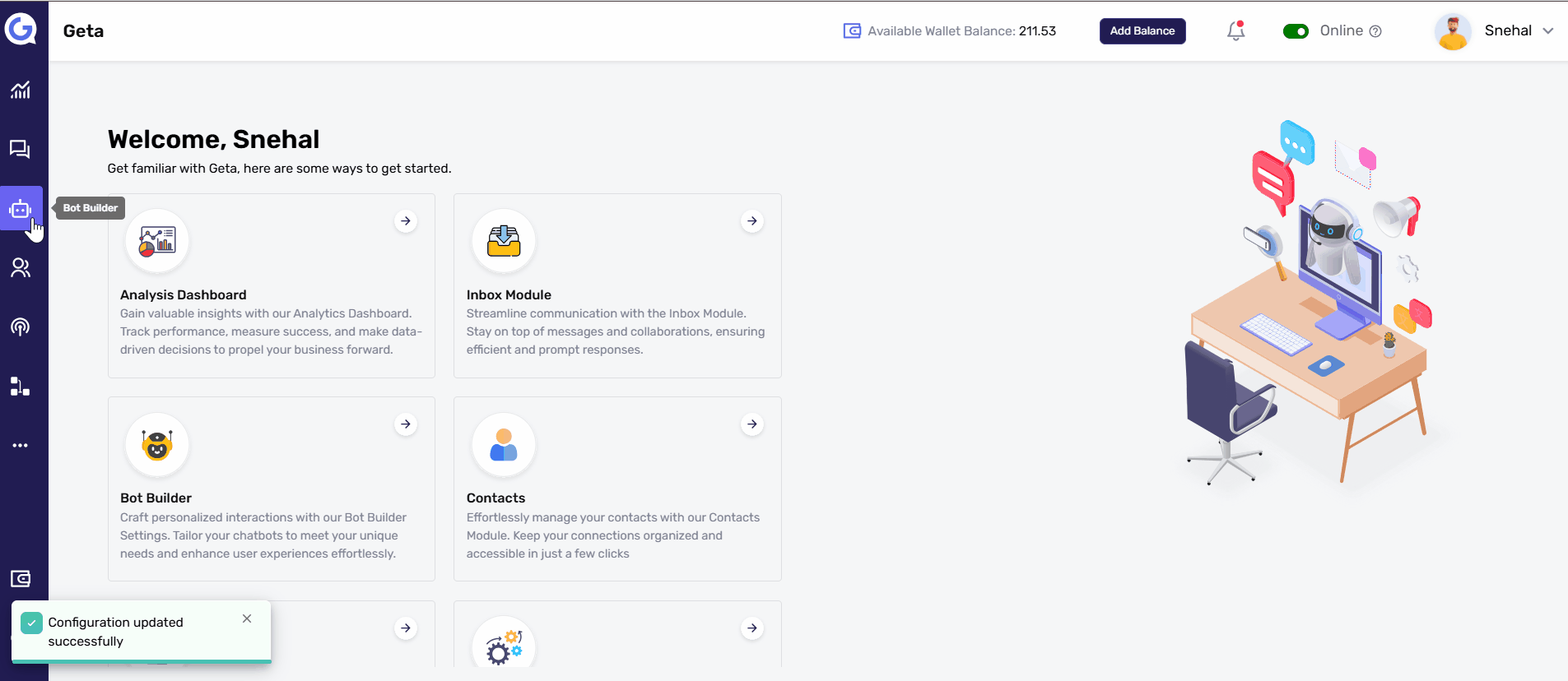 The Notification Block allows you to enhance user engagement by displaying visually appealing notifications with actionable elements. This guide walks you through the steps to configure the Notification Block in the Geta.ai platform.