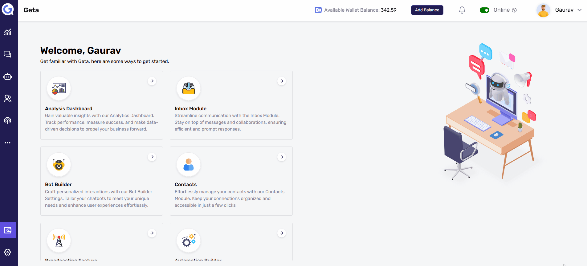 Adding wallet balance or purchasing credits in Geta.ai is simple and ensures you have sufficient funds for various platform activities. This feature helps manage your account balance effectively, keeping your campaigns running smoothly.